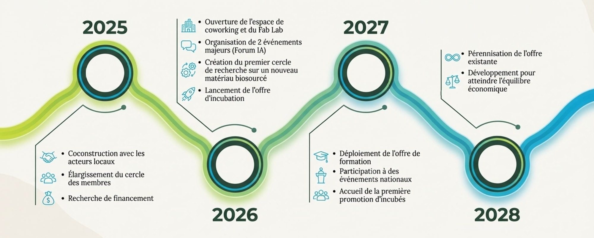 Ce programme d'accompagnement de 14 mois — d'octobre 2026 à décembre 2027 — est conçu pour accueillir une première cohorte de 5 à 8 structures locales engagées dans la transition écologique. Il leur proposera un suivi collectif et individualisé : diagnostics de maturité environnementale, ateliers thématiques, co-construction de feuilles de route, mise en réseau et accès à notre FabLab.