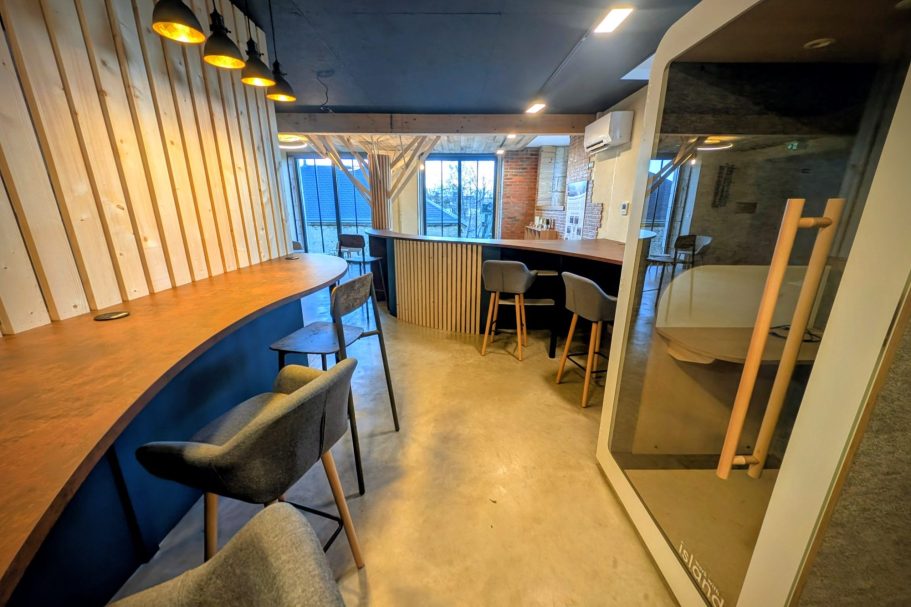 Deux espaces de coworking sont disponibles mais réservés exclusivement aux adhérents et une cabine insonorisée permet de prendre des appels sans se gêner .